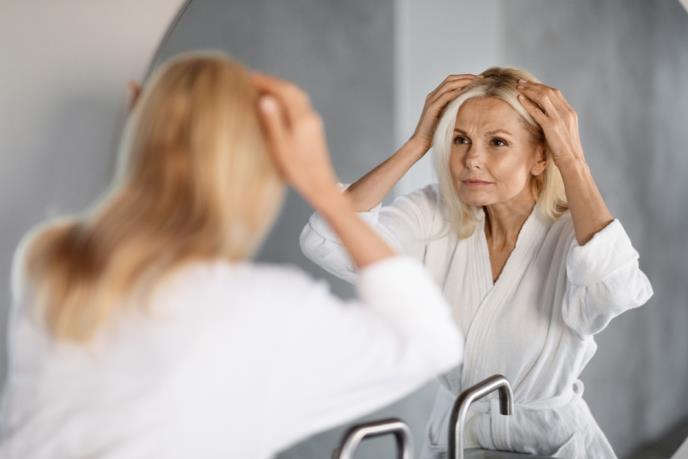 žena srednjih godina gleda se u ogledalu i primećuje veliki sedi izrastak kose
